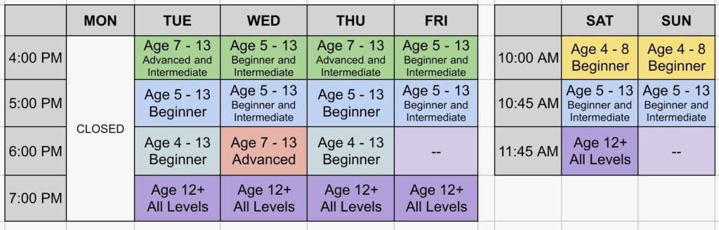We are actively enrolling new students. To inquire about our schedule and pricing, or want to book a FREE trial class, please click the link below. After signing up, you’re welcome to walk in for the free trial class at your earliest convenience, with no need to wait for our follow-up. Please make sure to bring water and wear comfortable clothing and socks. See you soon!!!